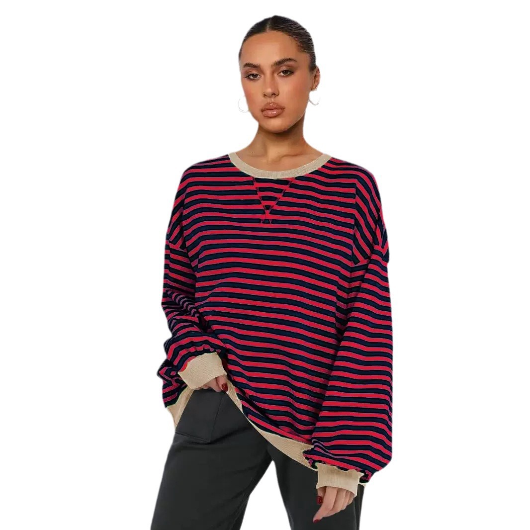 Autumn personality versatile contrasting color splicing off shoulders fashionable casual loose striped terry sweatshirt